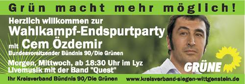 Die heimischen Landtagskandidaten Johannes Remmel und Florian Kraft laden für Mittwoch, den 5.5., ab 18.30 Uhr ins Lyz zu einer großen Wahlkampfendspurtparty ein.